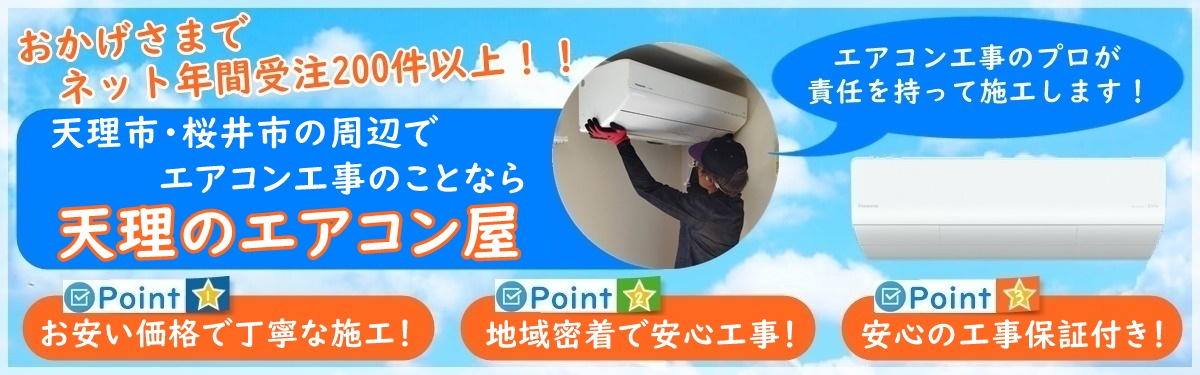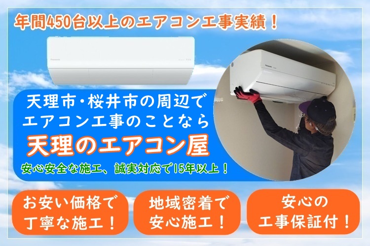 天理のエアコン屋は家庭用のエアコン工事を主にエアコン取り付け・取り外し工事をおこなっている地域密着のエアコン業者で、天理市・桜井市を中心に奈良県で活動しております。